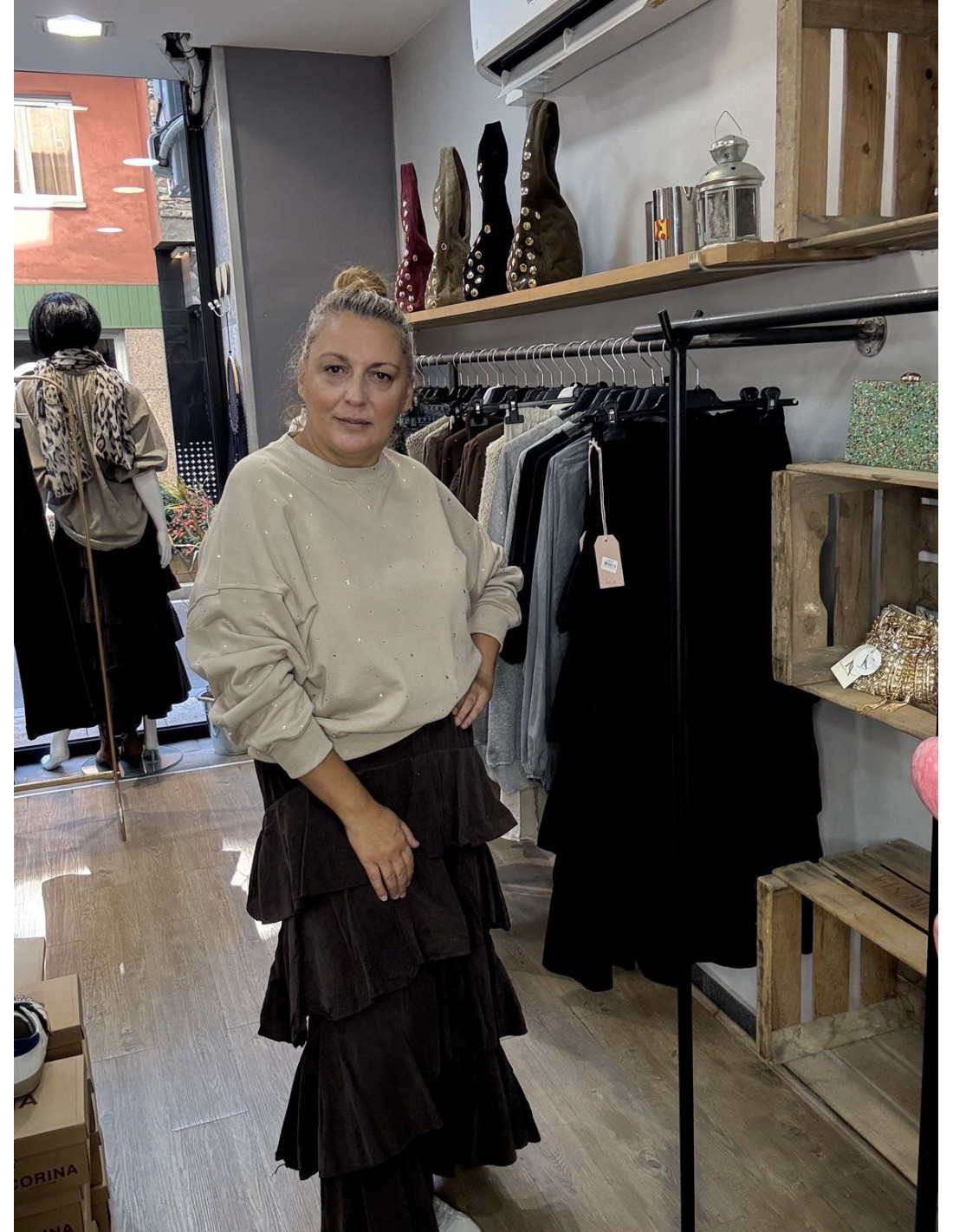 Espectacular modelo de falda larga con cintura con goma y volantes.