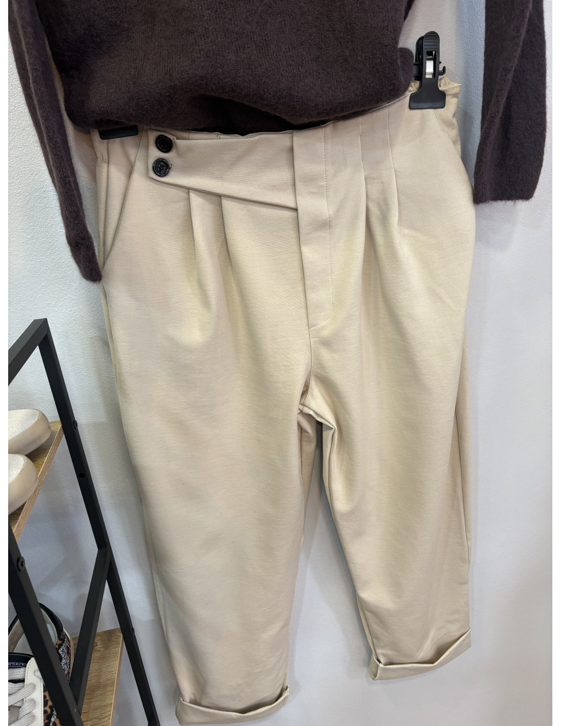 Este pantalón se destaca por su estilo moderno con detalles únicos.Modelo con bolsillos, cintura elastica de tras ,falsa cremallera y detalle de botones.