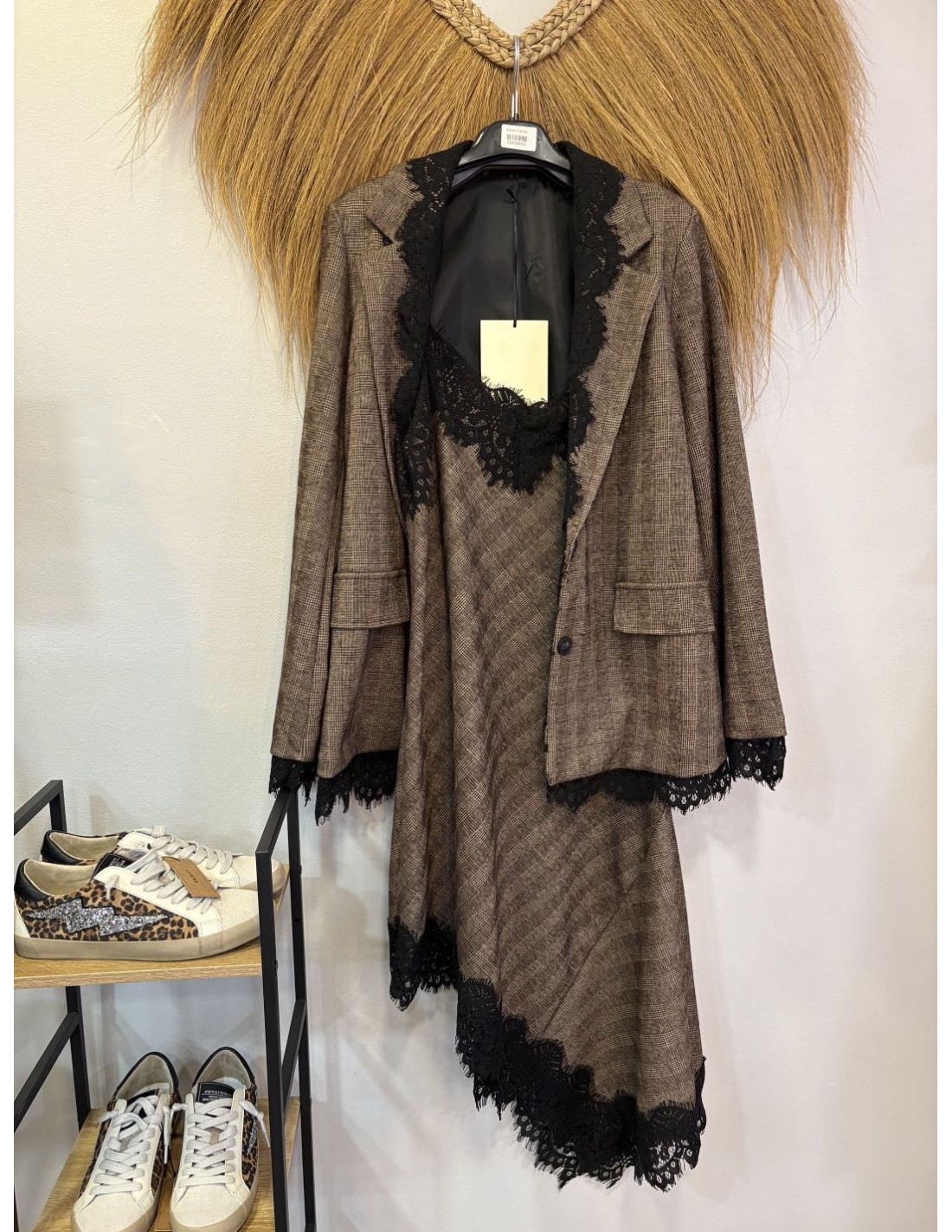 vestido cuadro encaje marron